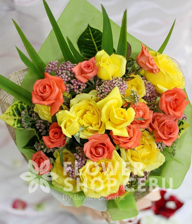 A round bouquet of 1 Dozen yellow roses and 1 Dozen peach roses. Accentuated by pink rice flowers, Wrapped in japanese papers.