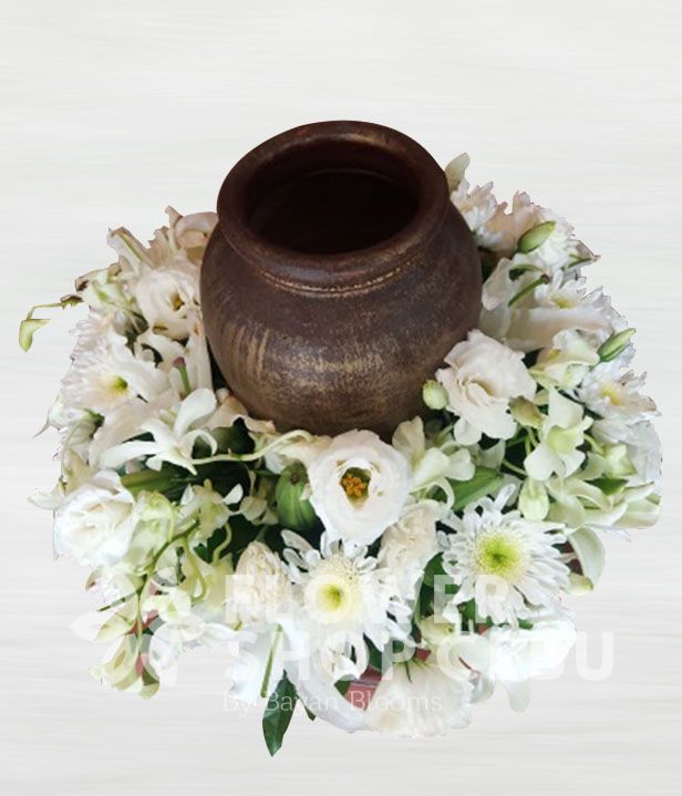 This urn arrangement is composed of white orchids, white paper roses, and white roses.