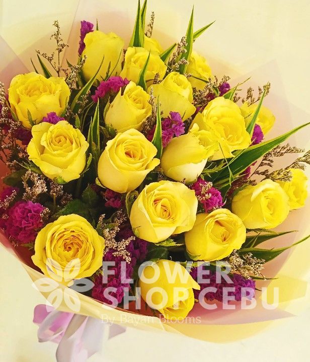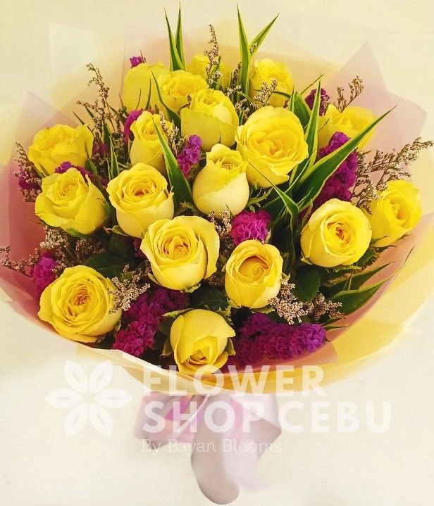 A bouquet consists of 18 pcs. Yellow roses with statice purple fillers.